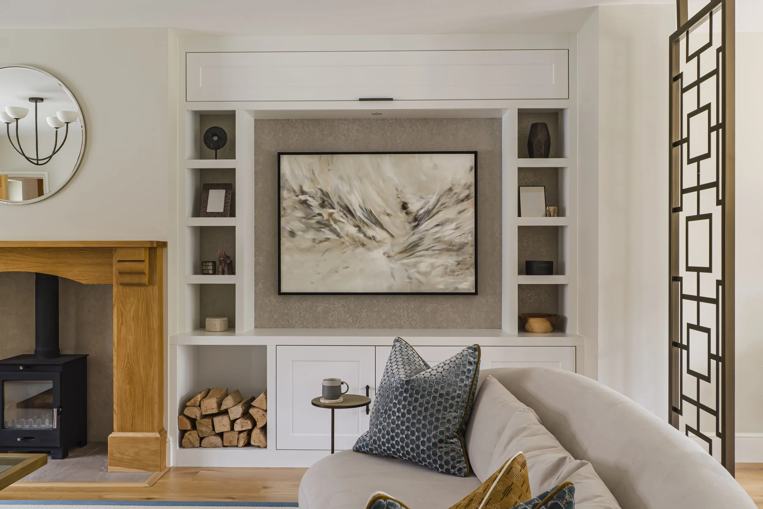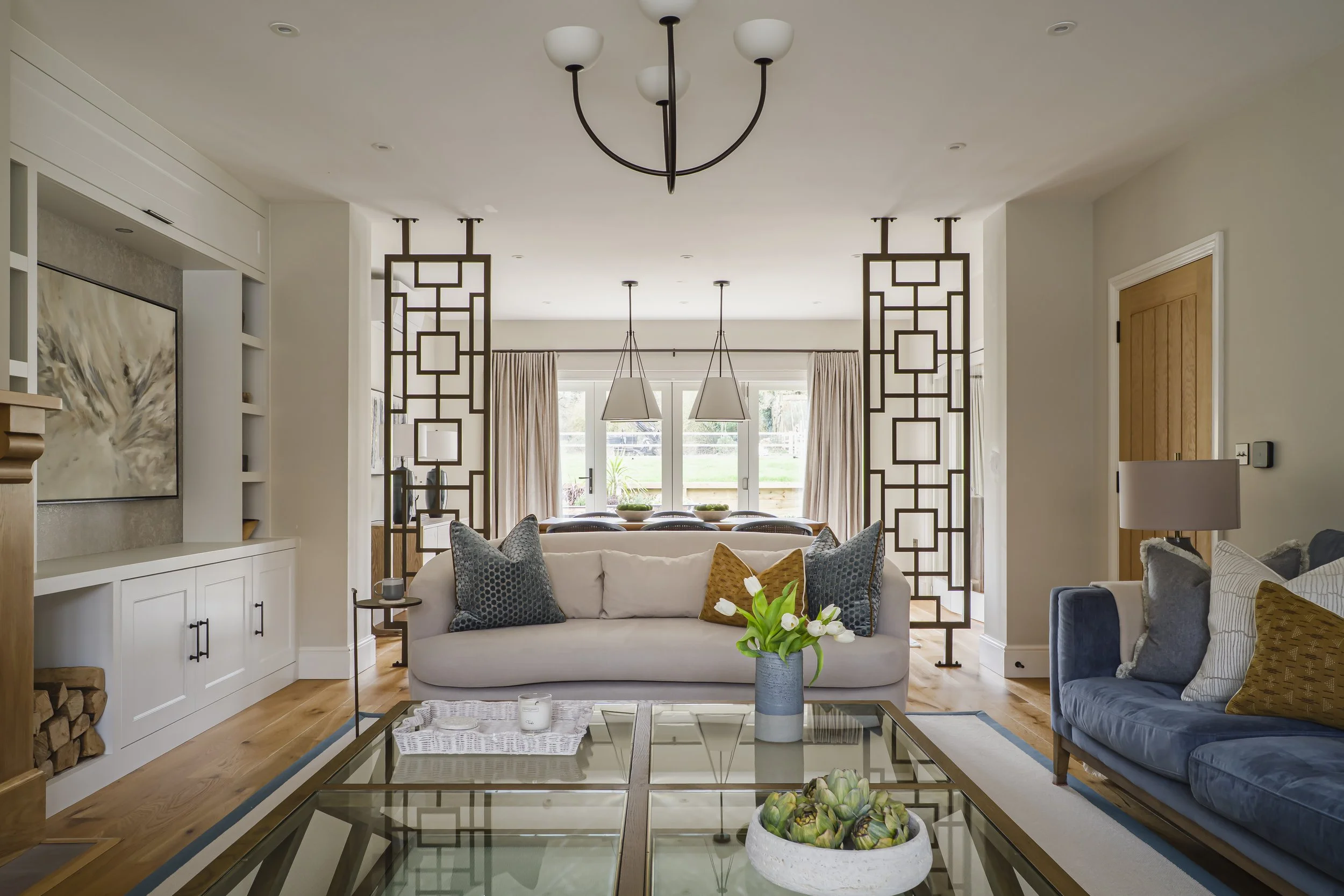 Set in the Bedfordshire countryside, Lime House is a modern newly built farmhouse style property. This interior photography captures the living and dining transformation by Georgina Robertson Interiors, blending traditional farmhouse look with a contemporary modern feel, with carefully compartmentalised spaces.